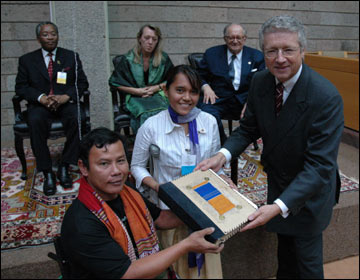 Bulletin Board | ![]() Nairobi Summit President Wolfgang Petritsch presents a copy of the 2004 Nairobi Declaration – signed by representatives of over 100 States – to “representatives of the public conscience” Tun Channaret and Song Kosal of Cambodia. Observing this presentation are: the Minister of Foreign Affairs of Kenya, Chirau Ali Mwakwere; 1997 Nobel Peace Prize laureate, Jody Williams; and, former President of the ICRC and current President of the Geneva International Centre for Humanitarian Demining, Cornelio Sommaruga. |